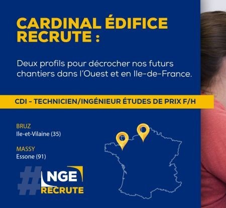 [#RECRUTEMENT] ? Annonce de la semaine : Nous recherchons actuellement deux techniciens / ingénieurs études de prix F/H pour nos agences Cardinal Edifice de Bruz (35) et de Massy (91) ? Vous vous appuierez sur votre formation d'ingénieur et sur une première expérience dans le bâtiment ou les travaux publics pour participer aux réponses d'appels d'offres dans votre zone. Vous pouvez candidater dans le secteur géographique de votre choix juste ici : - En Île-de-France ? https://preprod.nge.fr/nos-offres-demploi/technicien-ingenieur-etudes-de-prix-h-f-2021-1834/ - En Bretagne ? https://preprod.nge.fr/nos-offres-demploi/technicien-ingenieur-etudes-de-prix-h-f-2021-1832/ Cardinal Edifice, filiale bâtiment de #NGE, intervient dans la construction, l’entretien et la rénovation d’ouvrages en gros œuvre, en entreprise générale ou en conception-réalisation de tous types de bâtiments. #NGErecrute #recrutement #emploi #BTP #IDF #Bretagne #ingénieur