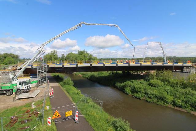 Fin mars, les équipes de #NGE, TRABET et BERTHOLD BTP lançaient l’ouvrage au-dessus de la Moder dans le cadre de la réalisation de la Voie de Liaison Sud de Haguenau pour le compte de la Communauté d'Agglomération de Haguenau. Place maintenant au bétonnage de l’ouvrage ! L’opération a eu lieu la semaine dernière : 7h de travail ont été nécessaires pour parer la charpente métallique de béton. Au total, 140m3 de béton ont été coulés sur cet ouvrage de 59 mètres de long. Suivez la page NGE - BTP pour suivre toutes les actualités de ce chantier et de tous nos autres projets en France et à l'international ! #BTP #batiment #travauxpublics #GrandEst #construction #pont