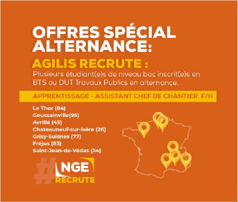 [#RECRUTEMENT] ? Annonce spéciale #ALTERNANCE : AGILIS recrute en contrat d'apprentissage plusieurs étudiants de BTS ou DUT avec spécialité dans les Travaux Publics. Afin d'acquérir le bagage technique et l'expérience du métier, vous accompagnerez sur le terrain le chef de chantier dans ses tâches quotidiennes : ✔️Pilotage et motivation des compagnons. ✔️Expertise technique dans la réalisation des travaux. ✔️Relai avec les équipes. ✔️Contrôle de la livraison des matériaux et des engins de travaux. ✔️Gestion du planning hebdomadaire Si vous êtes motivé(e) et savez faire preuve d'initiative et d'organisation, nous attendons votre candidature juste ici ? https://preprod.nge.fr/nos-offres-assistant-chef-de-chantier-f-h-en-alternance/ Spécialiste de l’équipement de la route, des sols sportifs et de l’aménagement des espaces, AGILIS offre une gamme complète de services de la conception et réalisation des travaux à l’entretien de ces derniers. Cette filiale du groupe #NGE est en plein développement et travaille sur une multitude de chantiers partout en France, alors n'hésitez plus et rejoignez-nous ? #BTP #TravauxPublics #emploi #ngerecrute #icicarecrute #apprentissage