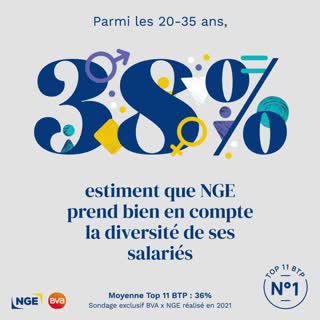 [#SONDAGE] Découvrez chaque jour un chiffre clé du baromètre #NGE X BVA 2021 des affinités des #millenials avec le #BTP. Parmi les leaders du #BTP, NGE est reconnu par les millenials de façon préférentielle sur leurs critères sociétaux de prédilection : ? 38% des 20-35 ans sondés estiment que #NGE prend bien en compte la diversité de ses salariés, alors que la moyenne générale du top 11 est de 36%. ??́??????? ???????? : - 38% ?????????? ?????̂? ???? - 16% ?????????? ?????̂? ??? - 46% ?? ?? ???????? ??? À demain pour un nouveau chiffre ! #enquete #chiffres #batiment #travauxpublics #RSE #QVT #diversité #generationY #futureofwork (Et vous, où serez-vous demain ??)