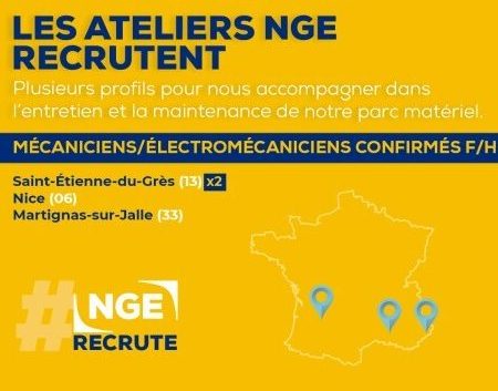 [#RECRUTEMENT] ? ANNONCE SPÉCIAL MÉCANIQUE : NGE recherche plusieurs mécaniciens, électromécaniciens, techniciens experts, (F/H) partout en France pour intégrer les différents ateliers du Groupe. Si vous disposez d'un diplôme de type Maintenance des Matériels Agricoles ou Travaux Publics et que vous êtes capable d'intervenir sur un parc matériel diversifié comprenant notamment des engins de terrassement, de canalisation et de VRD, nous attendons votre candidature ici ? https://preprod.nge.fr/nos-offres-mecanique/ Le parc matériel de NGE comprend plus de 1 500 machines et - ateliers en France et dans le monde. Ces engins, avec les 13 500 femmes et hommes de NGE participent à créer, construire et rénover les infrastructures et bâtiments au service des territoires. #NGE #BTP #emploi #ngerecrute #onrecrute #TravauxPublics #mecanique #maintenance