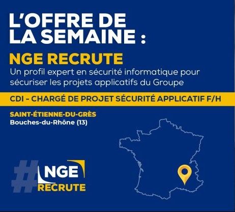 [#RECRUTEMENT] ? Annonce de la semaine : Dans le cadre de la création de notre pôle sécurité informatique, nous recherchons un(e) Chargé(e) de projet sécurité applicatif dont le poste sera basé au siège de #NGE, à Saint-Étienne-du-Grès (13). Vous souhaitez participer au déploiement d’un projet stratégique. Vous disposez de solides connaissances dans le domaine du DevSecOps, API, des protocoles d’authentification ainsi qu’en architecture et administration des BDD, alors ce poste est fait pour vous ! Si le challenge vous intéresse, vous pouvez proposer votre candidature ici ? https://preprod.nge.fr/nos-offres-demploi/charge-de-projet-securite-applicatif-h-f-2020-1299/ #cybersécurité #informatique #BTP #sécuritéinformatique #nouvellestechnologies #developpeur #ingenieur #projets #DevOps #architecture #cloud #BDD #job #emploi #onrecrute #ngerecrute
