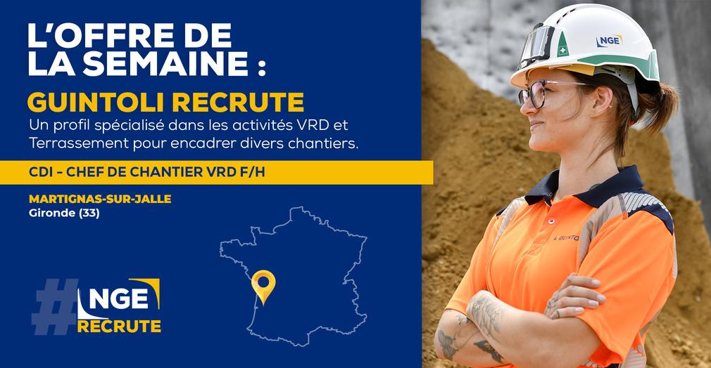 [#RECRUTEMENT] ? Annonce de la semaine : Notre agence Guintoli en Nouvelle-Aquitaine recherche un chef de chantier F/H pour gérer la préparation, la planification et la supervision des chantiers VRD/Terassement. Votre expérience dans le secteur des travaux publics et dans la gestion de chantiers vous permettra de mener à bien les travaux de l'agence en tenant compte de toutes les contraintes techniques et des normes de sécurité. Si le défi vous intéresse, vous pouvez proposer votre candidature ici ?https://preprod.nge.fr/nos-offres-demploi/chef-de-chantiers-vrd-h-f-2021-1442/ Filiale du Groupe #NGE, Guintoli est reconnu comme un acteur majeur des travaux de terrassements généraux et de VRD. Fort d’une expérience acquise au cours de plusieurs décennies sur les grands chantiers de construction d’autoroutes et de LGV, Guintoli intervient sur l’ensemble du territoire en tant que véritable spécialiste des mouvements de terre. #NGE #BTP #emploi #ngerecrute #TravauxPublics #terrassement #VRD