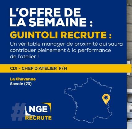 [#RECRUTEMENT] ? Annonce de la semaine : Notre filiale @Guintoli recrute un Chef d'Atelier F/H à La Chavanne en Savoie (73) ! Sur ce poste, vous aurez pour missions d'organiser le travail de votre équipe et d'être en support sur les interventions techniques. #NGE #BTP #TravauxPublics #VRD #Terrassement #Emploi #NgeRecrute #Savoie