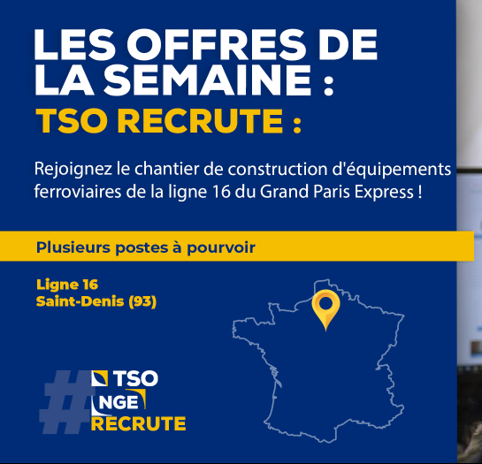 [#RECRUTEMENT] ? Annonce de la semaine : TSO, travaux ferroviaires est une filiale du Groupe NGE - BTP en plein essor spécialisée dans les travaux ferroviaires. ? Nos équipes, réalisent la construction des équipements ferroviaires de la future ligne 16 du métro parisien, de Saint-Denis à Aulnay. Dans ce cadre , plusieurs postes sont à pourvoir : - Electromécanicien H/F https://nge-career.talent-soft.com/Pages/Offre/detailoffre.aspx?idOffre=3206&idOrigine=505&LCID=1036 - Mécanicien H/F https://nge-career.talent-soft.com/Pages/Offre/detailoffre.aspx?idOffre=3208&idOrigine=505&LCID=1036 - Chef d’équipe en formation H/F https://nge-career.talent-soft.com/Pages/Offre/detailoffre.aspx?idOffre=3251&idOrigine=505&LCID=1036 - Agent RH H/F https://nge-career.talent-soft.com/Pages/Offre/detailoffre.aspx?idOffre=3234&idOrigine=505&LCID=1036 - Conducteur de travaux H/F https://nge-career.talent-soft.com/Pages/Offre/detailoffre.aspx?idOffre=3261&idOrigine=505&LCID=1036 - Chef de chantier H/F https://nge-career.talent-soft.com/Pages/Offre/detailoffre.aspx?idOffre=3240&idOrigine=505&LCID=1036 Si vous pensez correspondre au profil recherché, vous n'avez plus qu'à postuler ! ?♀️?♂️ Rejoindre #NGE, c'est rejoindre un groupe en plein développement en France et à l'international. C'est aussi, intégrer une entreprise composée de 15 000 femmes et hommes réunis autour de 3 valeurs fortes : l'unité, la transparence et l'ambition. #NGE #Recrutement #SaintDenis