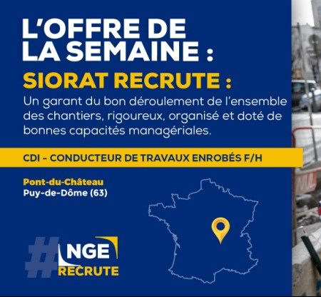 [#RECRUTEMENT] ? Annonce de la semaine : Dans le cadre du développement de notre activité Enrobés, notre filiale SIORAT recherche un Conducteur de Travaux Enrobés F/H à Pont-du-Château (63). #NGE #BTP #TravauxPublics #ngerecrute #RhôneAlpes