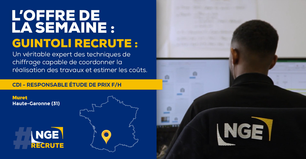 [#RECRUTEMENT] ? Annonce de la semaine : Notre filiale de terrassement @Guintoli recherche un Responsable Étude de Prix F/H à Muret en Haute-Garonne (31). Votre rôle sera de coordonner la réalisation des travaux, d'estimer les coûts futurs et de proposer les meilleures solutions techniques et financières aux clients. Vous devrez vous placer en véritable expert des techniques de chiffrage et justifier de 5 ans d'expérience dans le domaine des études de prix dans les travaux publics et idéalement dans le VRD. Si vous pensez correspondre à cette offre, vous pouvez postuler juste ici ? https://preprod.nge.fr/nos-offres-demploi/responsable-etude-de-prix-h-f-2022-2823/ Filiale du Groupe #NGE, Guintoli est reconnue comme un acteur majeur des travaux de terrassements généraux et de VRD. Fort d’une expérience acquise au cours de plusieurs décennies sur les grands chantiers de construction d’autoroutes et de LGV, Guintoli intervient sur l’ensemble du territoire en tant que véritable spécialiste des mouvements de terre. #NGE #BTP #emploi #ngerecrute #TravauxPublics #Terrassement #VRD #Occitanie
